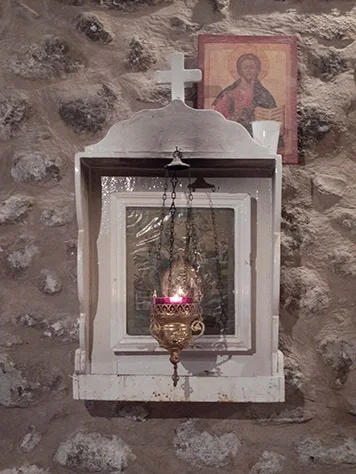 A lower floor of the same tower contains a much smaller chapel of Panagia. This was but a humble storeroom when the monks ran out of olive oil. Pressed into service, the famed anchorite George of Arselao was asked to pray over the empty vats. “We had better pray over only one, said the hermit, otherwise the room will not be able to contain all the oil.” True enough, the oil gushed up “as though from a spring” at his petition, and continued flowing until all the vats were filled. Saint George ascribed the miracle to “our Holy Mistress”, and the storeroom became the chapel of the Panagia of the Life-giving Spring, where Divine Liturgy is still celebrated every Wednesday in memory of the miracle.